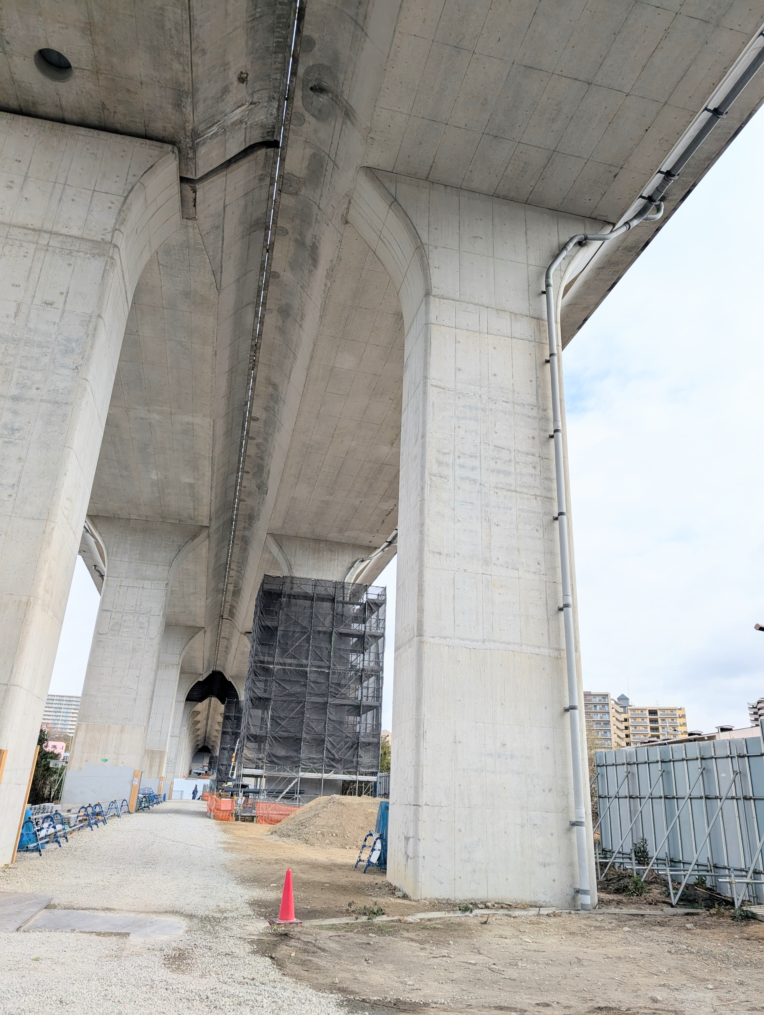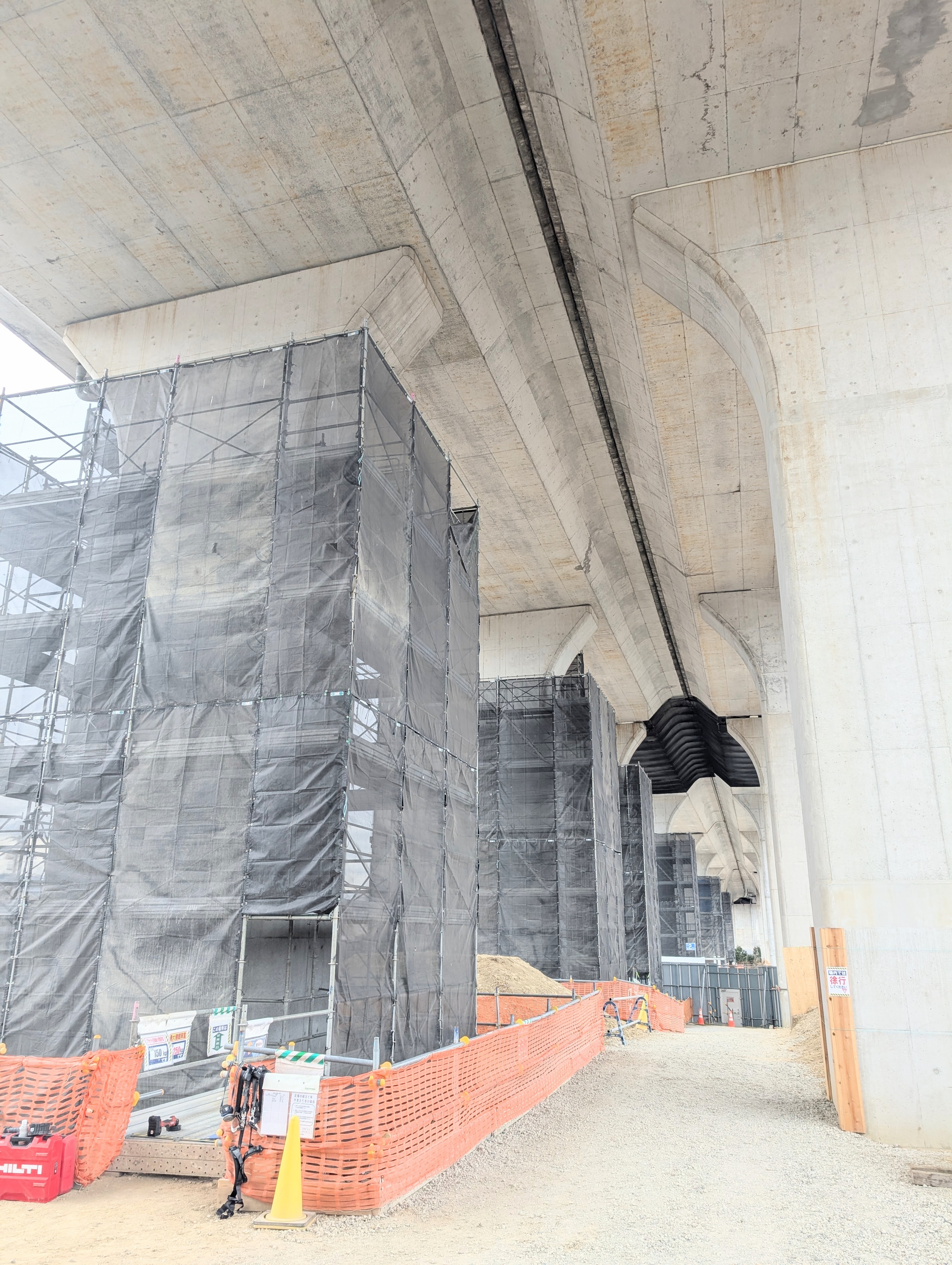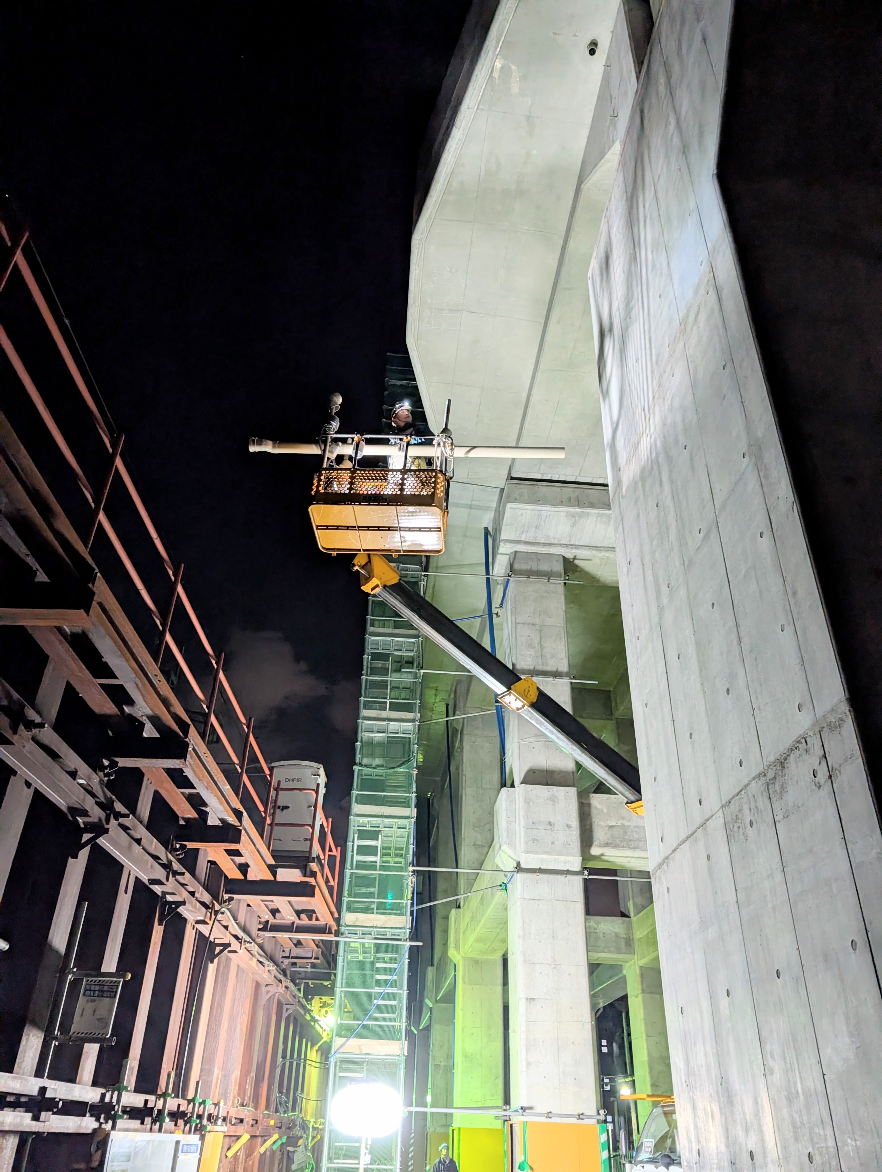 高架上、中層階での狭い隙間での作業。13カ所あるうちの一つ。寝ながらの作業。力が入らない体勢から、約4メートルのパイプを設置します。