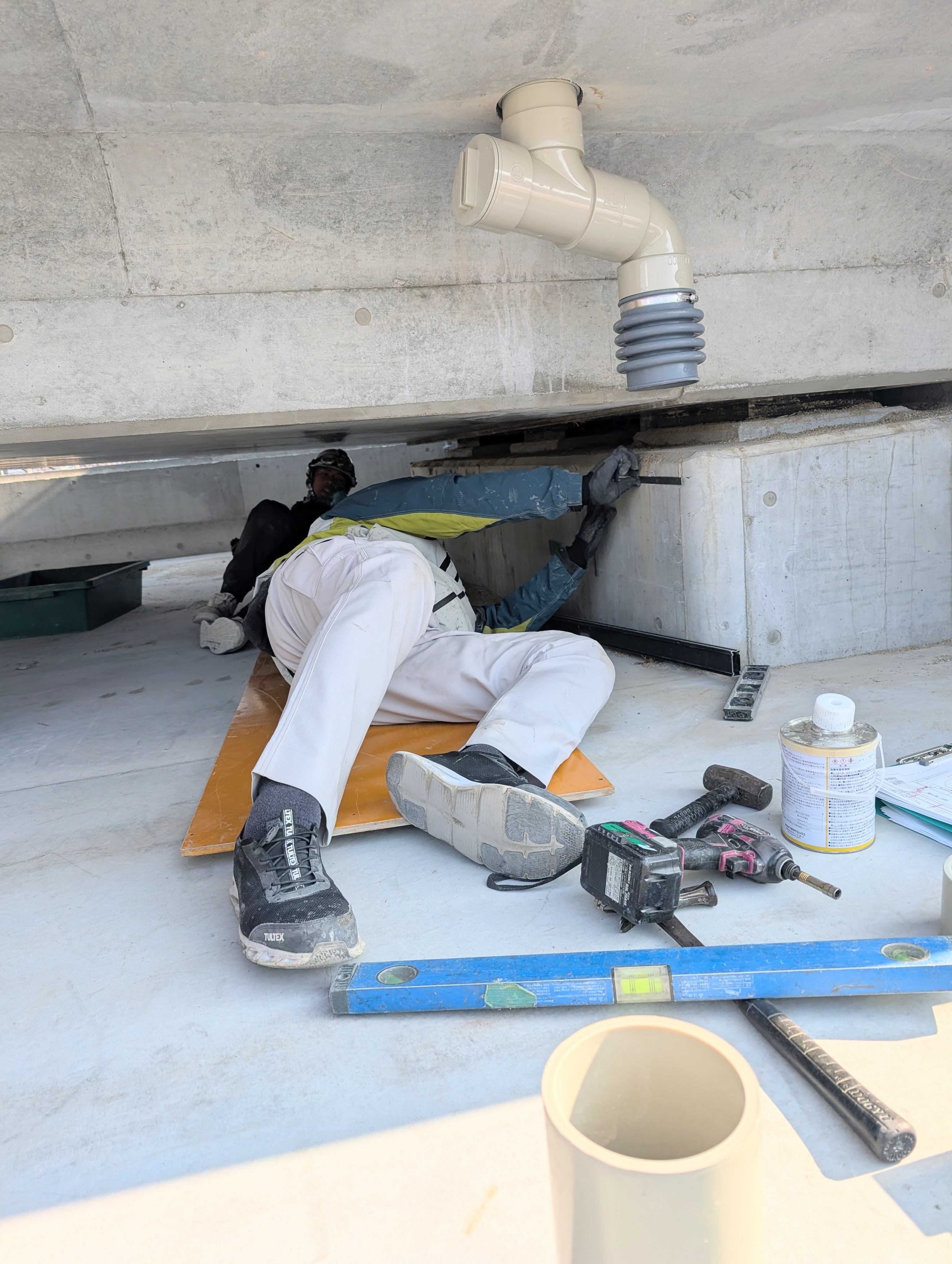桁下での排水管設置工事。ドレンからの長い排水管は中々珍しくブラケットのラインを綺麗に出してからの設置作業。